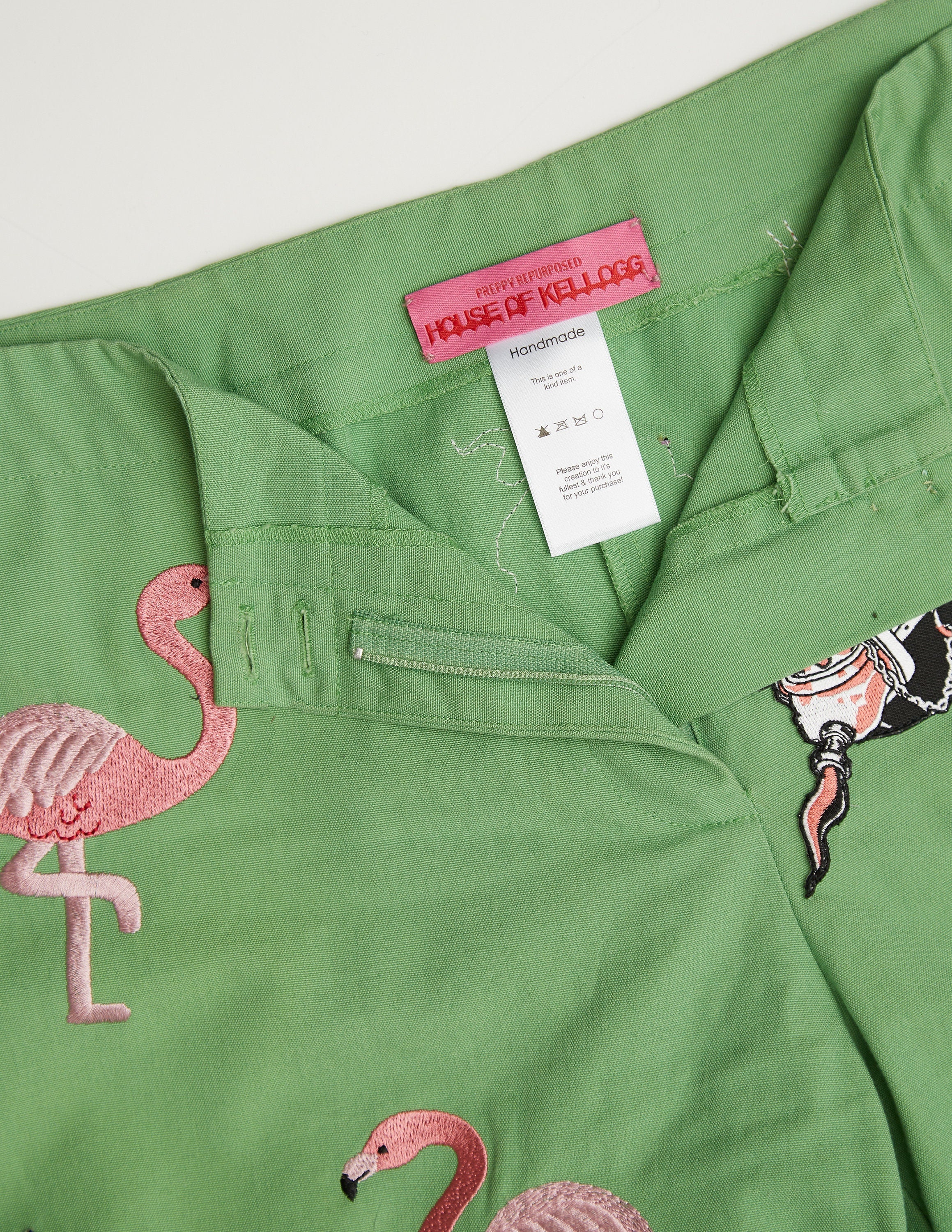 A one-of-a-kind embroidered pair of flamingo pants repurposed with Sexecutioner (from the band GWAR) patches sewn in throughout the front and back.